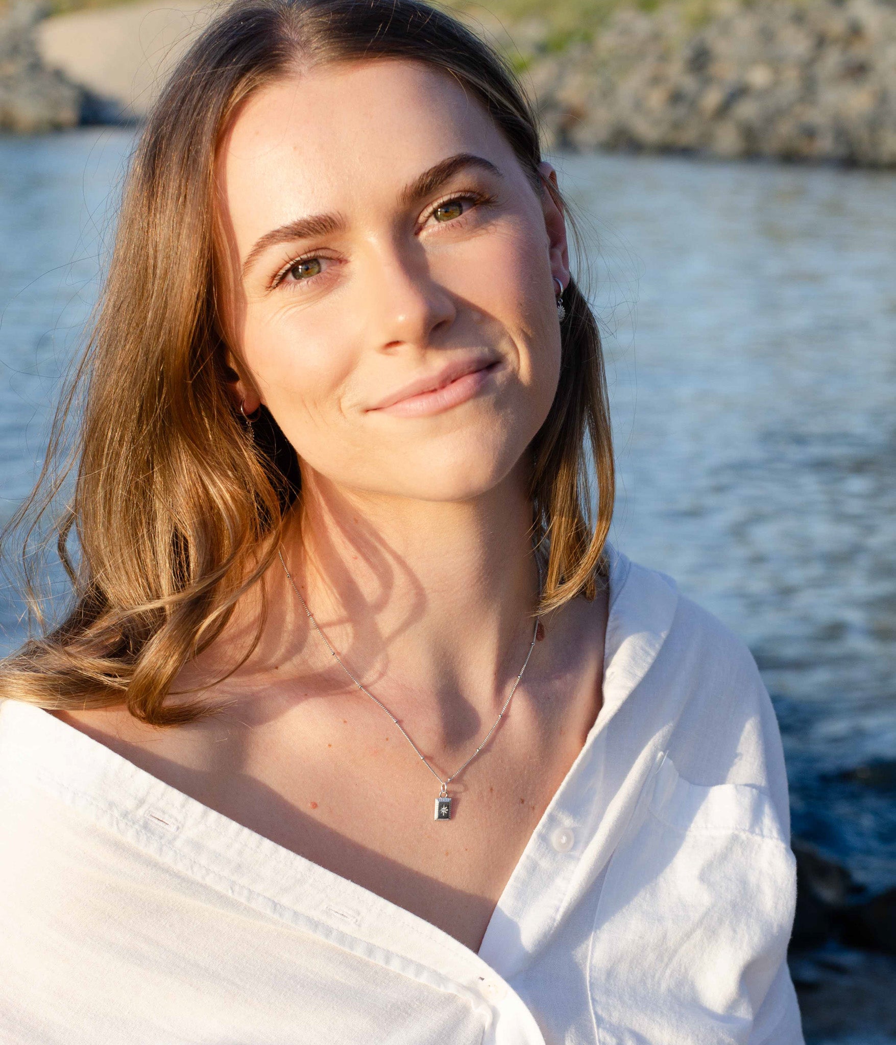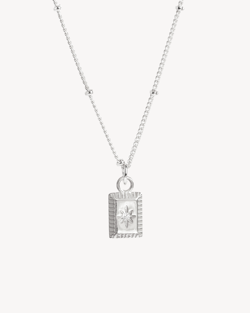 Our beautiful Phoebe Necklace, designed and created by us for everyday wear. This necklace brings a modern elegance to everyday jewellery. Featuring a sleek rectangular pendant with a radiant star-like gem at its centre, it’s a refined piece that shines with subtle sparkle.
